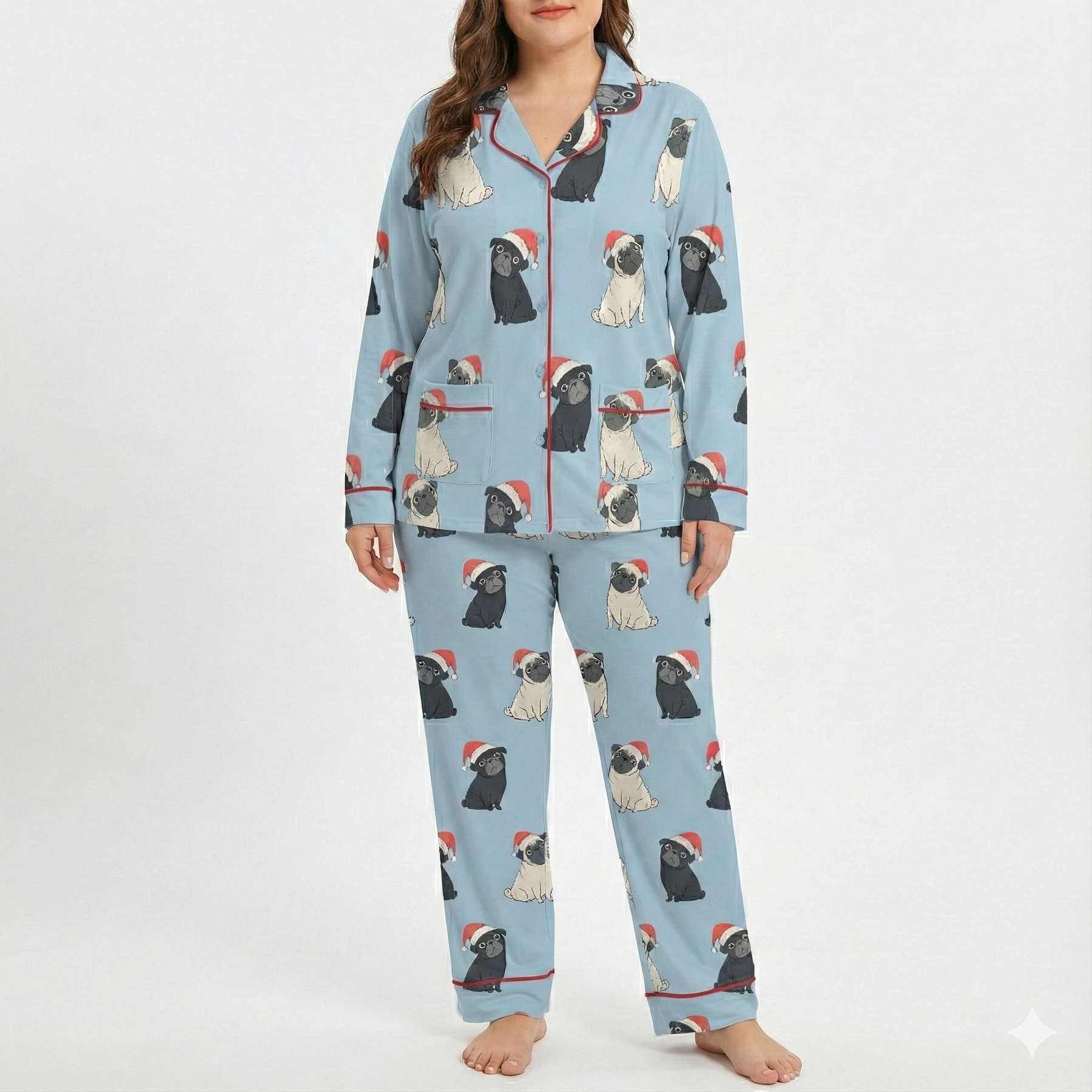 Get ready for the most pug-tastic holiday season with our Double Santa Pug Trouble Pajamas Set! Featuring adorable fawn and black pugs in a Santa hat, these unisex pajamas bring festive cheer and cozy comfort to your Christmas celebrations. The shirt boasts double pockets for stashing holiday treats or small gifts, while the matching pants include functional pockets too—because every pug lover needs somewhere to keep their essentials. Perfect for holiday parties, family photos, or lazy mornings!