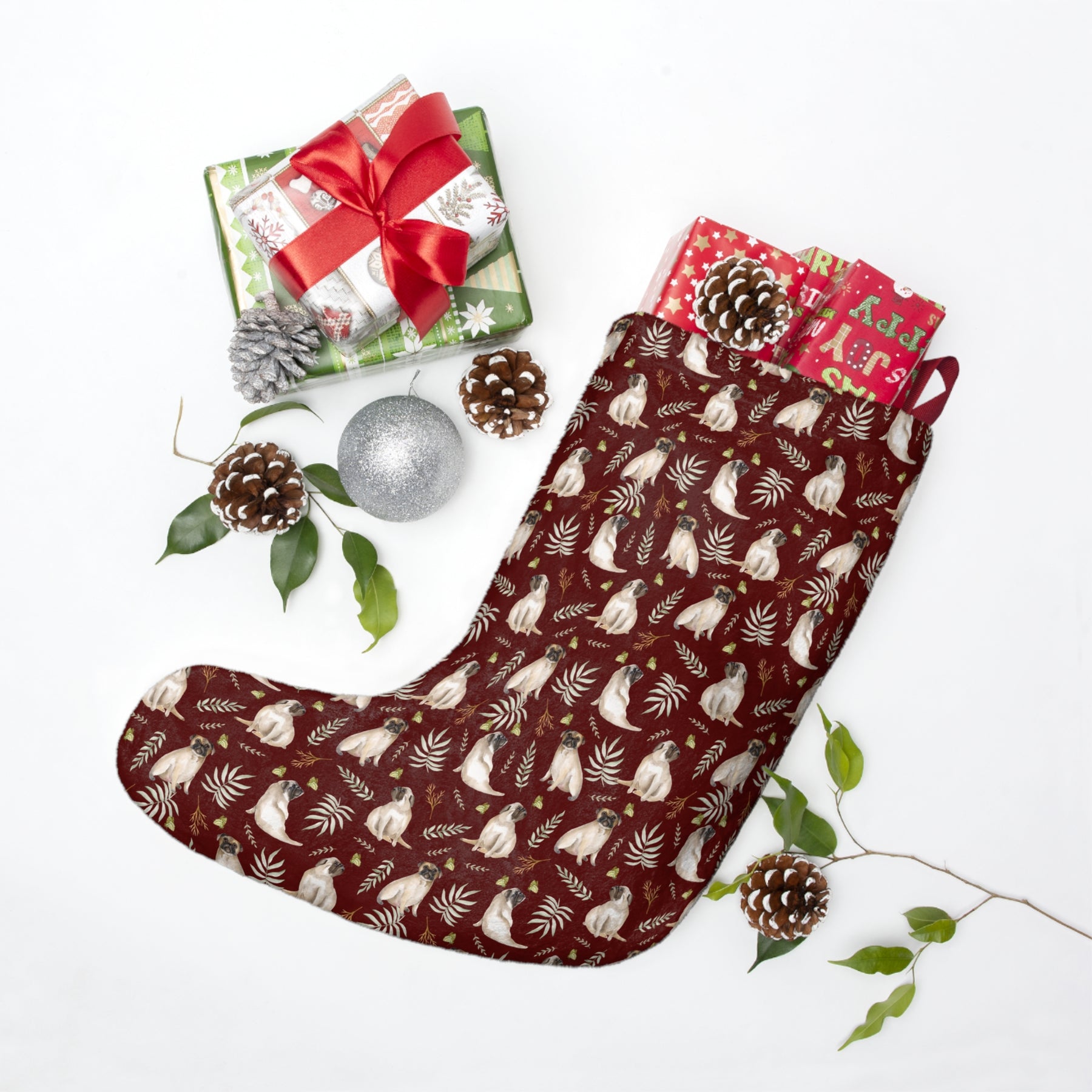 Bring a vibrant splash of color and pup-tastic fun to your holiday decorating with this Watercolor Pug Christmas Stocking! This red stocking features a delightful vintage watercolor pug to brighten up your mantel and spread some furry cheer! This adorable pug is just waiting for you to fill up the stocking with fun treats.