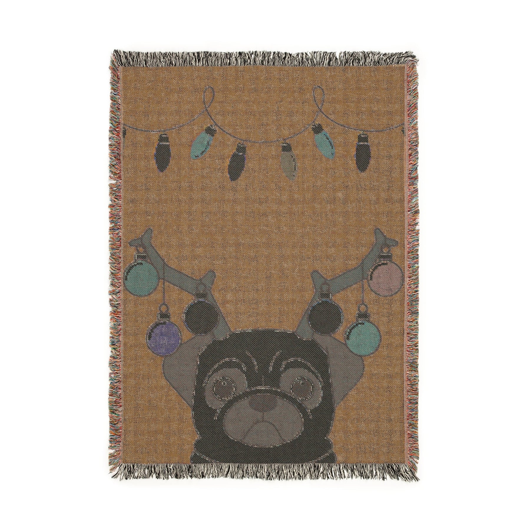 This woven blanket brings cozy, handcrafted warmth with a playful, illustrated touch. The design features a cute reindeer-pug dog wearing Christmas bulbs, rendered in a woven tapestry style that reads like a folk-art throw. Soft, 100% cotton threads give the surface a tactile, slightly textured feel and colorful fringed edges frame the piece for a finished, homey look.