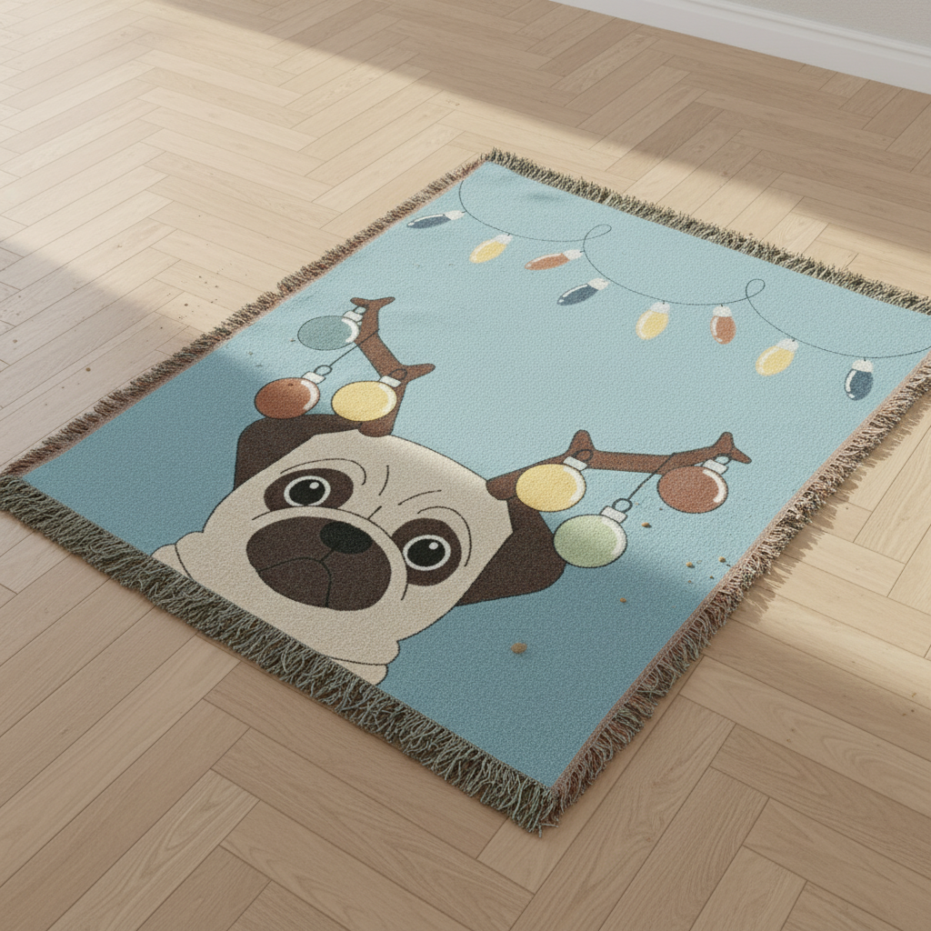 Wrap yourself in holiday cheer with this adorable Reindeer Pug Woven Throw Blanket! Perfect for cozy nights by the fireplace, this festive design features an irresistibly cute pug decked out in reindeer antlers and twinkling string lights. Crafted from soft, durable woven fabric, it's ideal for snuggling on the couch, draping over your bed, or gifting to fellow pug lovers. Whether you're a devoted dog parent or just can't resist holiday charm, this throw brings warmth and whimsy to your seasonal décor. Get ready for the most pug-tastic Christmas ever!