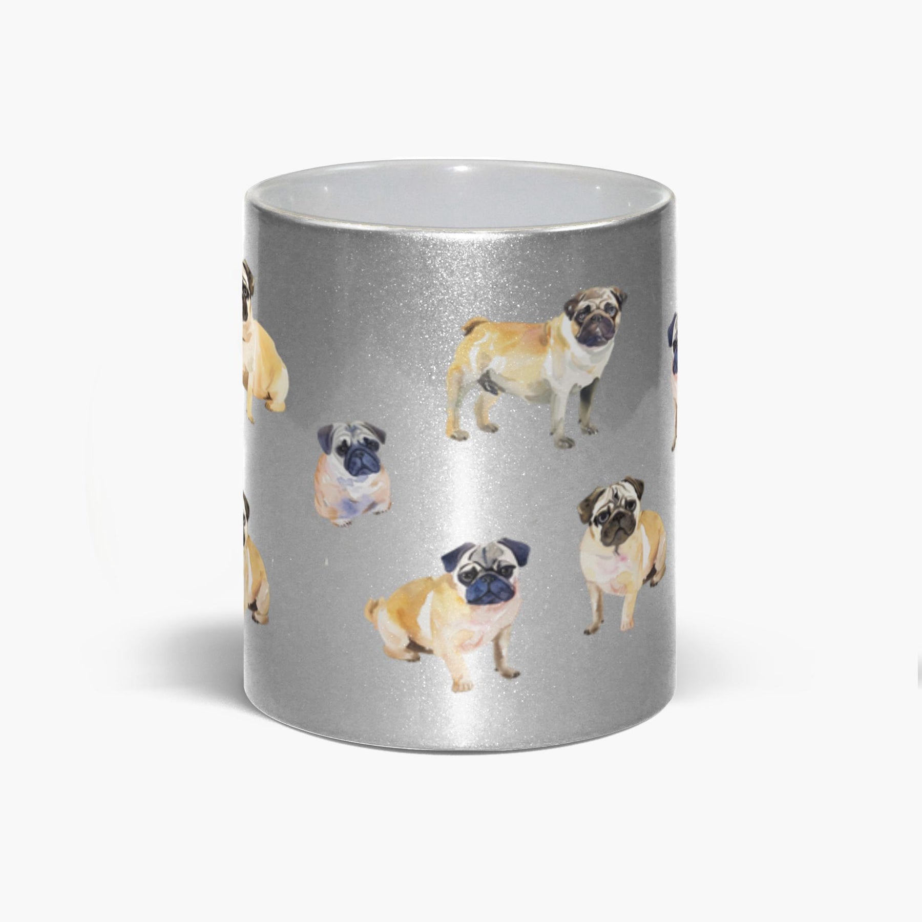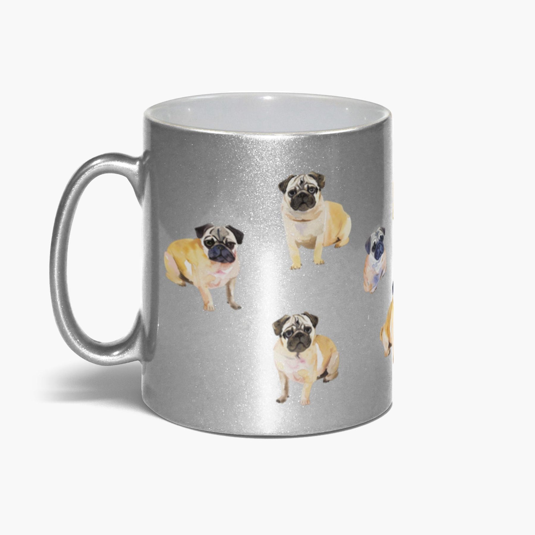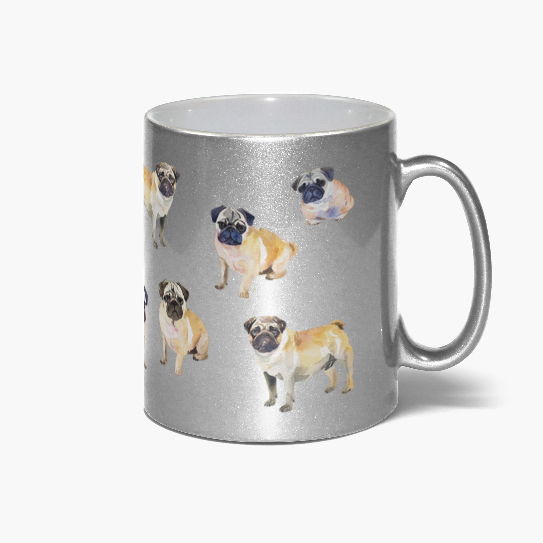 Sip in style with this charming 11 oz metallic silver mug featuring an adorable watercolor pug wrap design. Perfect for pug lovers and coffee enthusiasts alike, this mug brings a splash of whimsy to your morning routine. The playful artwork captures the quirky personality of everyone's favorite wrinkly companion. Dishwasher safe for easy cleanup, it's both a practical daily essential and a delightful gift for any pug parent.