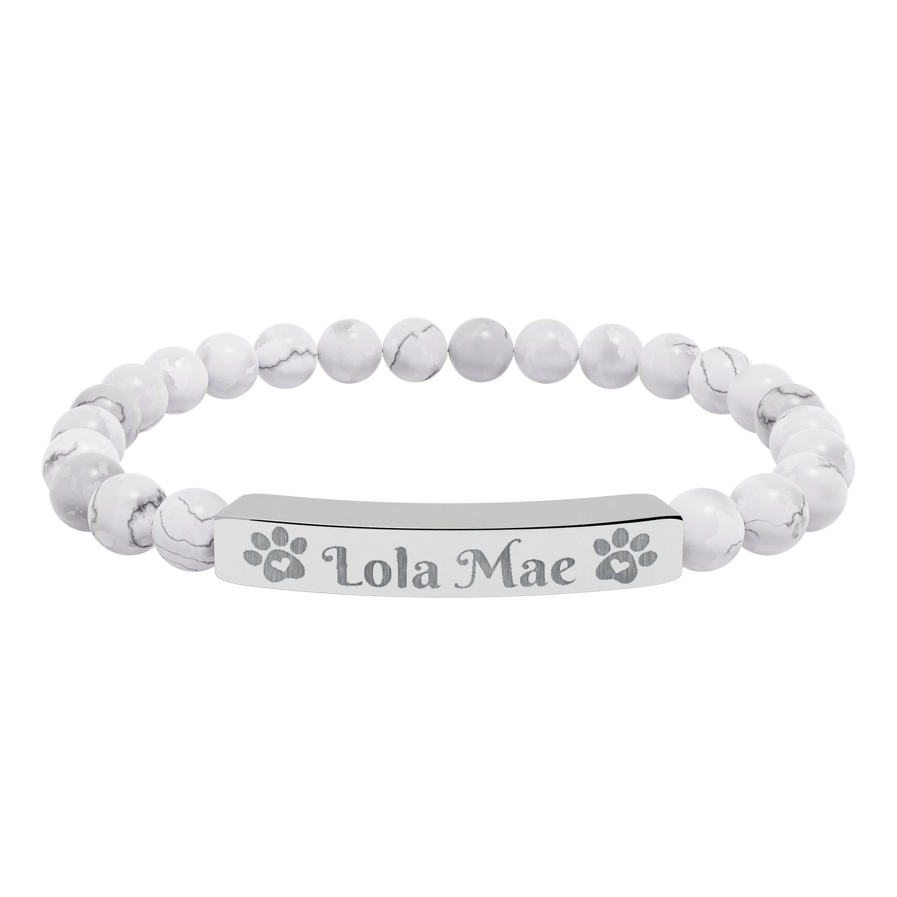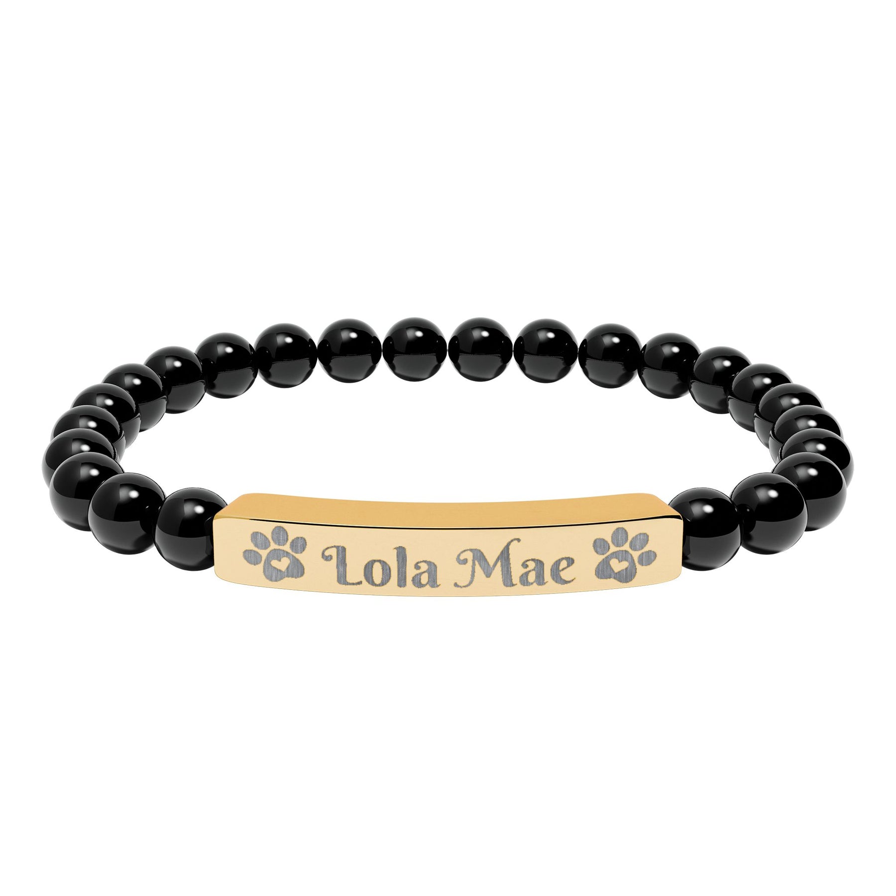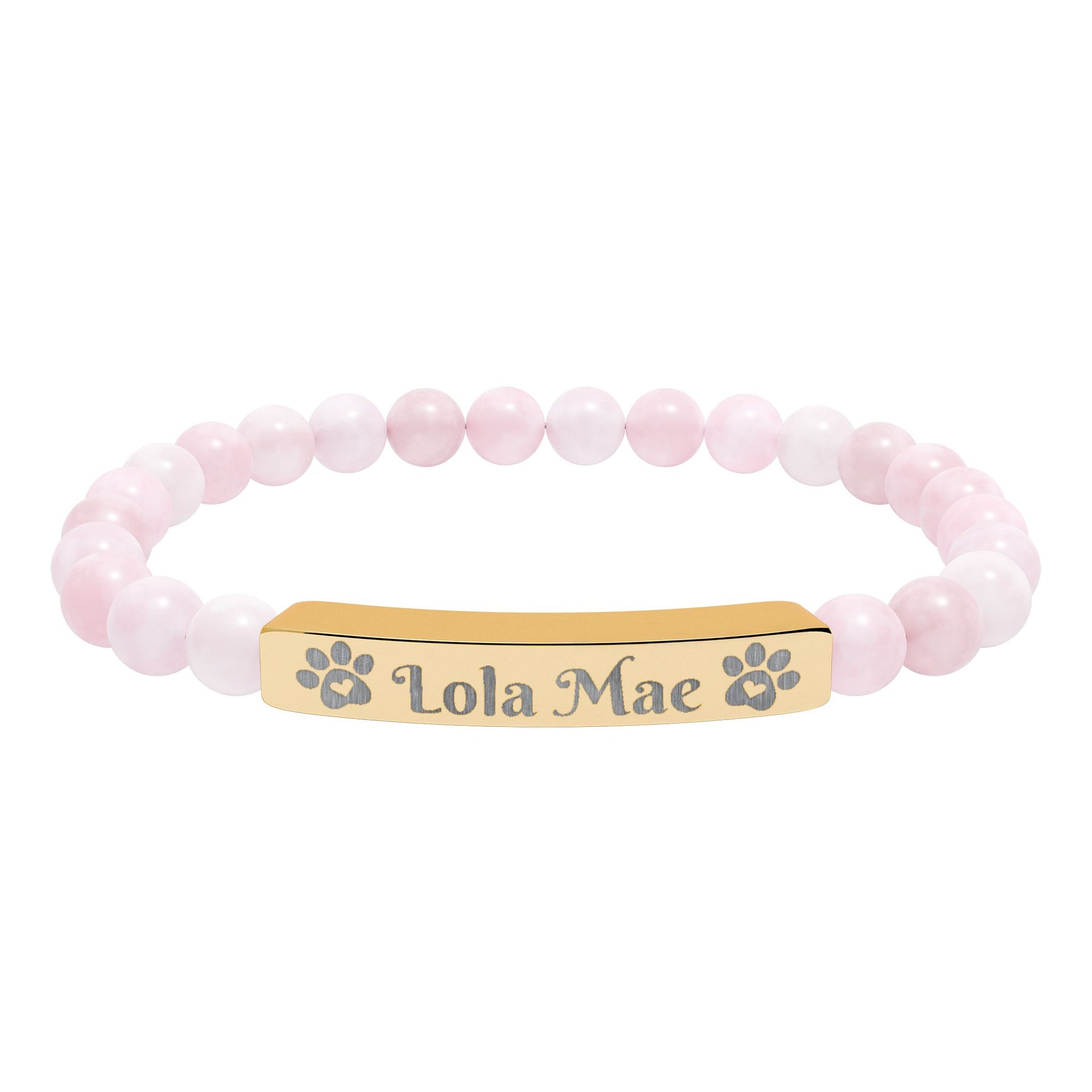 Celebrate your furry best friend with a bracelet as unique as they are! Choose from beautiful natural stones and customize it with your pup's name engraved on the bar. Whether you're a devoted dog parent or shopping for one, this personalized piece is the perfect way to keep your beloved companion close to your heart. A stylish accessory that tells your pet's story.