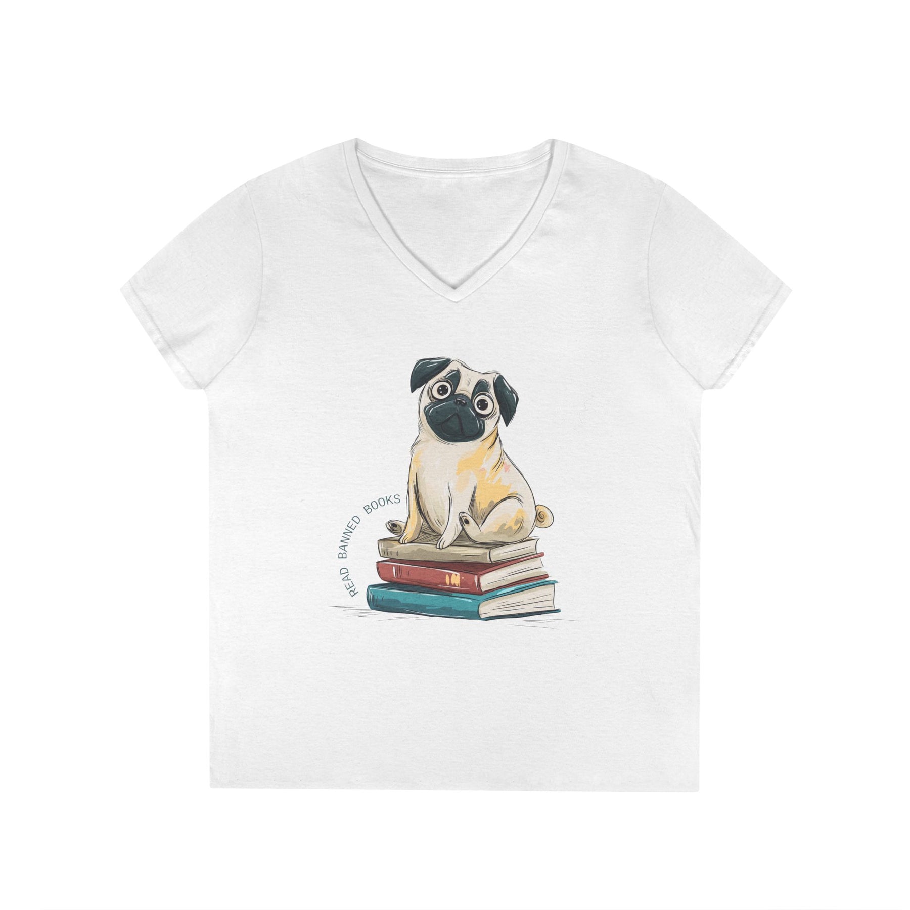 Embrace comfort and style with this charming Ladies' V-Neck Gildan T-Shirt. Featuring an adorable pug design, it instantly brings a lighthearted vibe to any outfit. Perfect for casual outings, cozy nights in, or relaxing at home, this tee effortlessly fits into your everyday wardrobe. It’s a great gift for dog lovers, book enthusiasts, and anyone who enjoys a touch of whimsy in their activism.