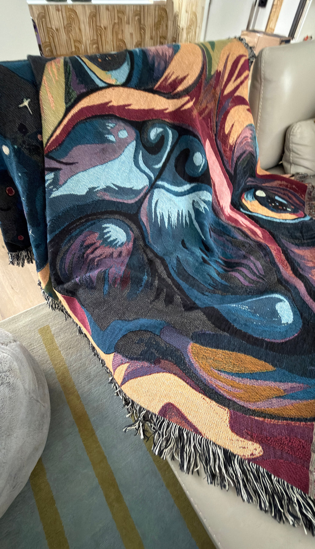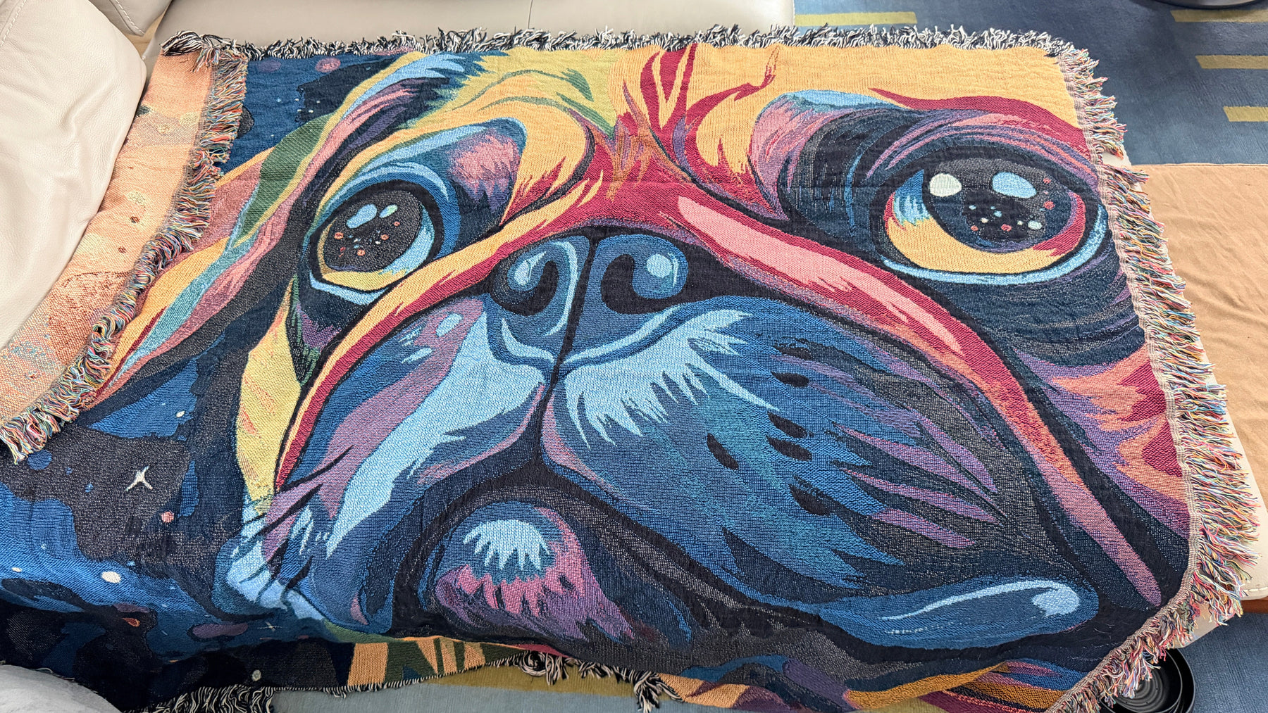 Wrap yourself in pug paradise with this charming woven throw blanket featuring an adorable pug face design. The celestial-inspired pattern gives it a whimsical, starry-eyed quality that'll make any pug lover smile. Perfect for cozy nights on the couch, adding a playful touch to your bedroom, or gifting to fellow pug enthusiasts. Soft, durable, and undeniably cute—this blanket is your new favorite companion.