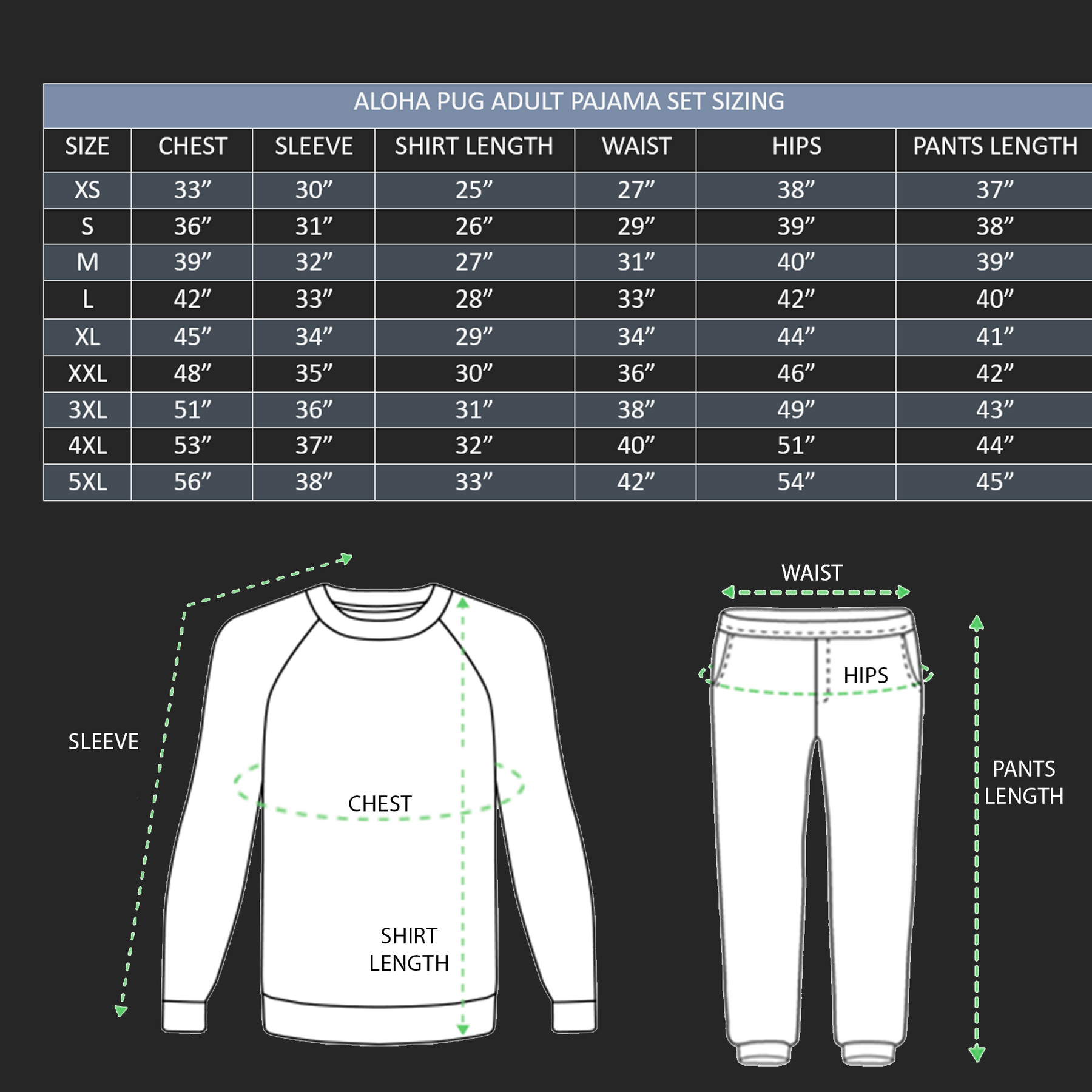 Children's sizes are tapered with an elastic waistband. Adult sizes have a drawstring. These pajamas are hand sewn to order from fabric designed by Aloha Pug. You can buy the complete set or just the pants or shirt separately.