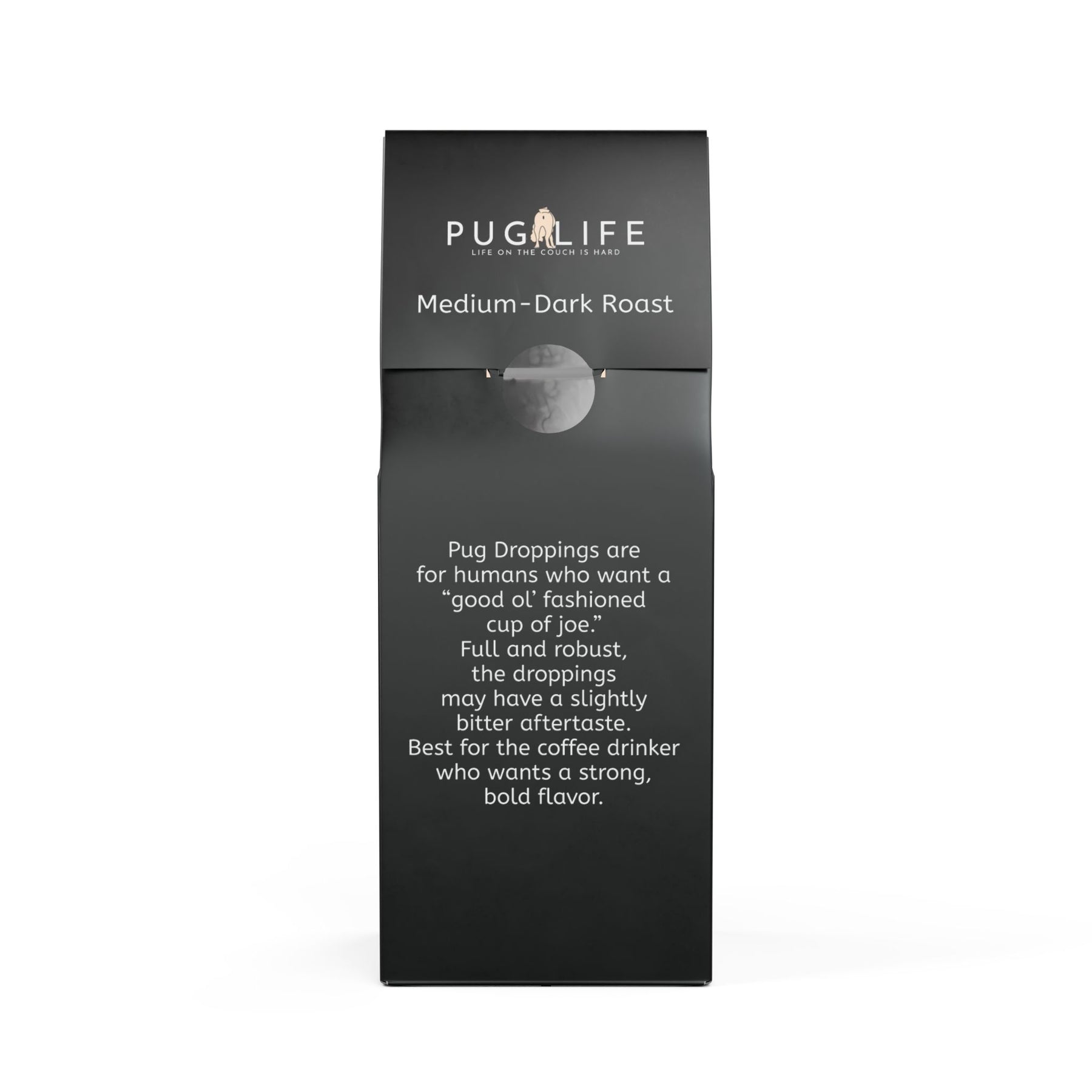 Pug Droppings are for humans who want a “good ol’ fashioned cup of joe.” Full and robust, the droppings may have a slightly bitter aftertaste. Best for the coffee drinker who wants a strong, bold flavor.