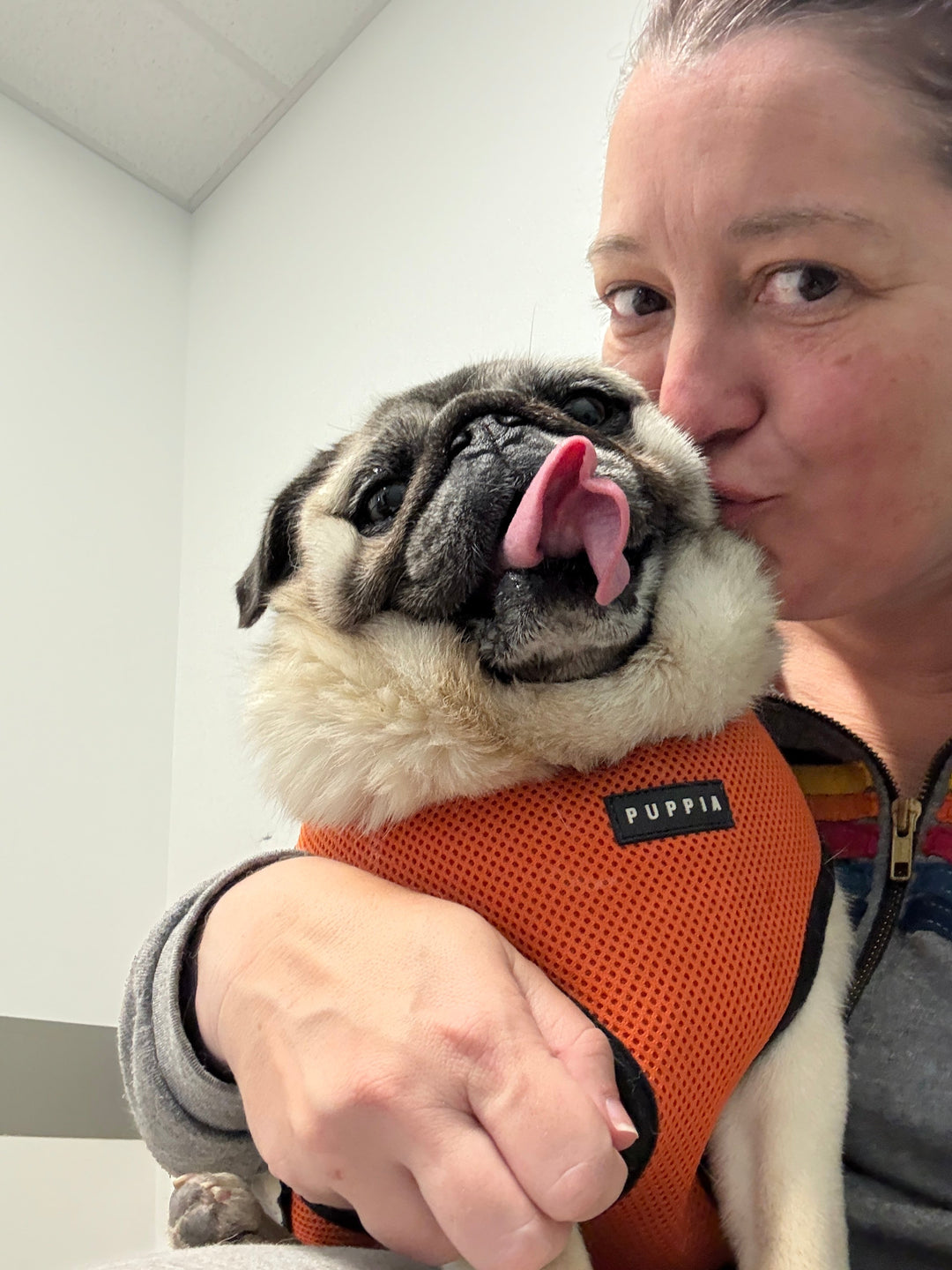 Lenore as a Puppy Pug lays on the chest of a woman with pink hair