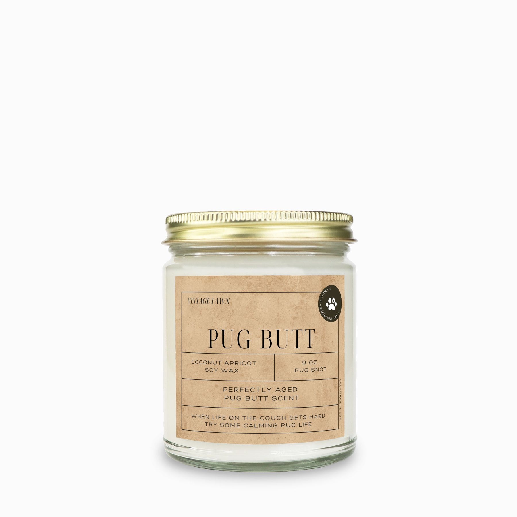 Pug Butt is a classic scent and this vintage is especially comforting, like being under a pile of pugs. This natural candle is hand poured in a white ceramic jar with a black top.